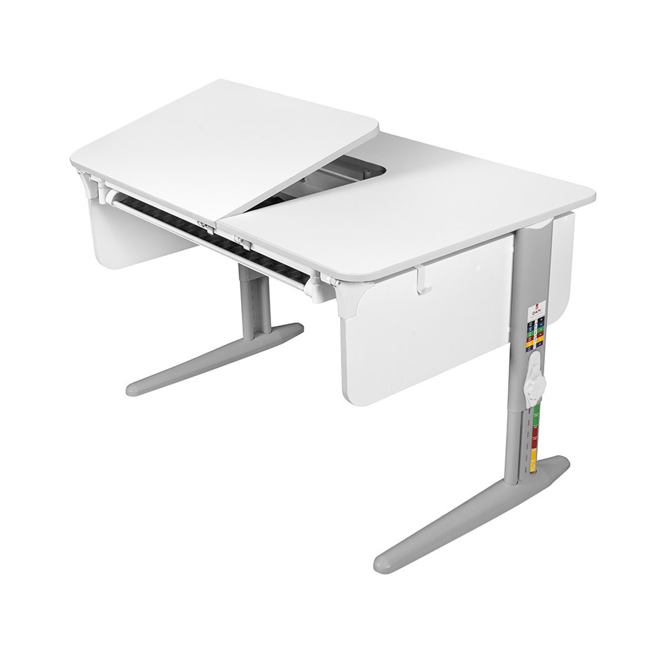 За такой партой удобно выполнять домашние задания, читать, писать, рисовать и заниматься другими делами. Столешница L-образной формы позволит хранить важные предметы на статичной части, а самое необходимое разместить на более широкой, подвижной части.